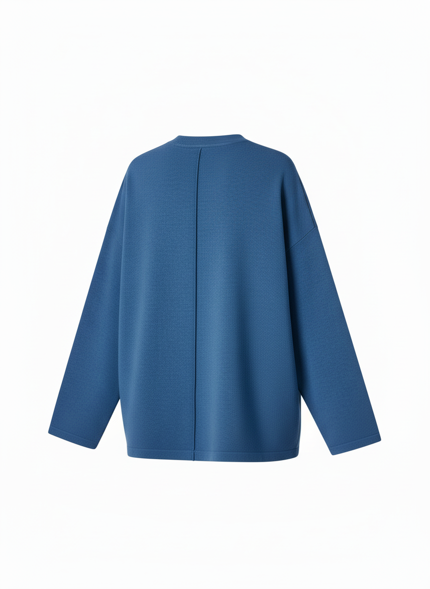 A thick vertical seam runs down the middle of the back. The fabric is a heavy weight that holds a rigid form. It has a wide neck opening with thick ribbing. The shoulders drop low on the arm. It sits flat against the body and resists folding. The hem is cut straight across. This shirt creates a sharp square silhouette and stays opaque under bright lights.